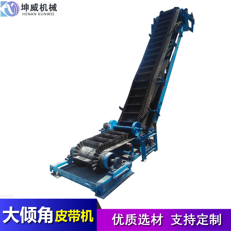 首先大傾角皮帶輸送機(jī)的輸送角度大,這個很明顯,普通型皮帶輸送機(jī)輸送角度只能是23°以下,需要大角度輸送的話就需要使用大傾角皮帶輸送機(jī)。而且大傾角皮帶輸送機(jī)的角度范圍在23-90°,比較靈活,可以根據(jù)現(xiàn)場情況布置不同角度的機(jī)器。